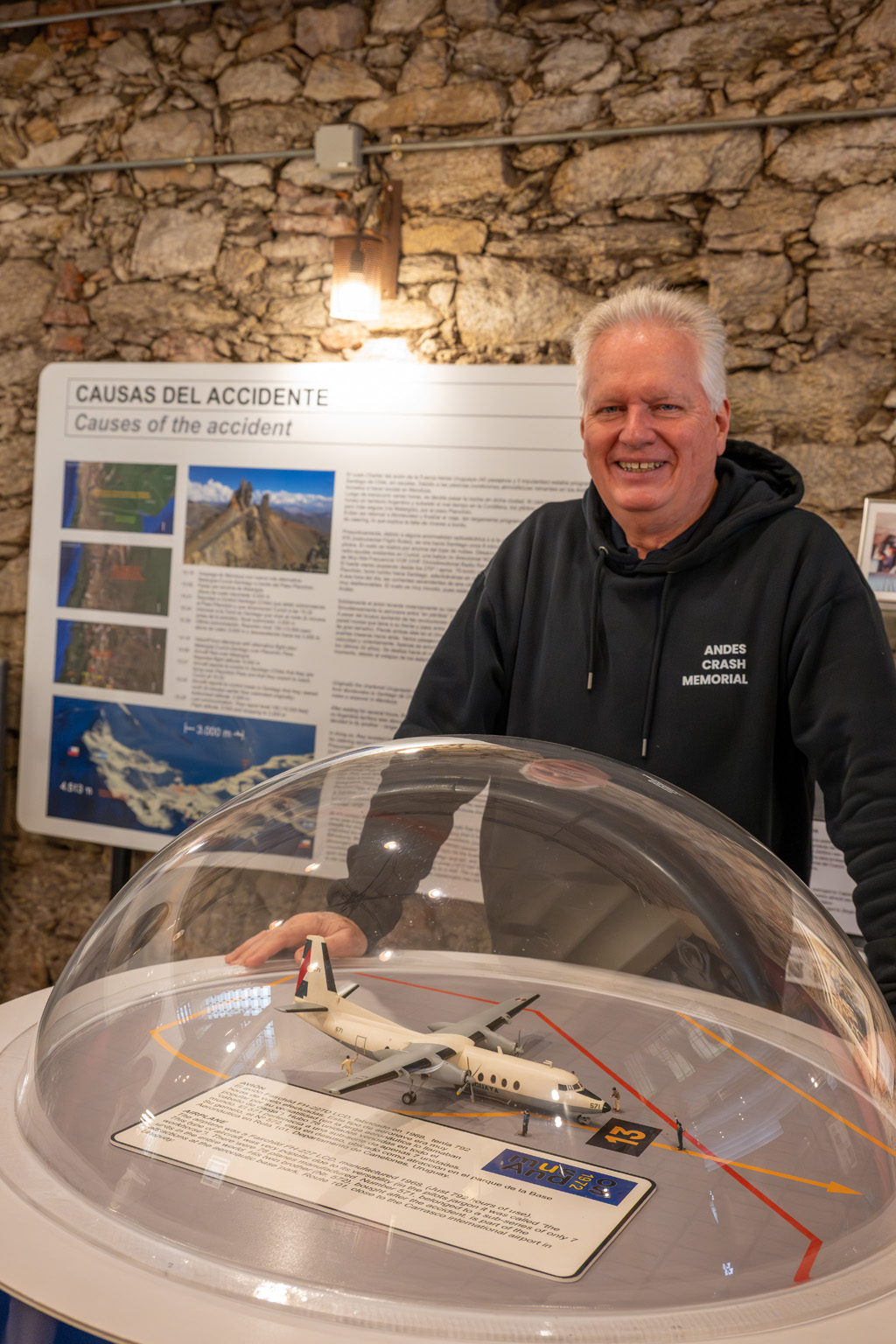 Daneben hängen Landkarten, auf denen die Absturzstelle eingezeichnet ist – mitten in der endlosen weißen Leere der Anden.