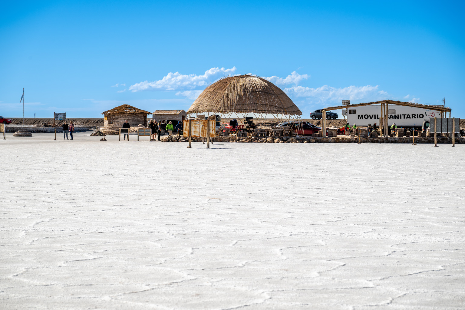 Das ging soweit gut, bis wir mit langsamen 70km/h dann eine für uns nicht sichtbare, aber tiefe, und dummerweise für die Räder breit genug geartete, Querrinne trafen, die das Auto derart durchschlagen ließ, dass ich dachte, die Stoßdämpfer kommen oben raus oder wir kommen von der Piste ab und überschlagen uns. Zwangsläufig fuhr ich dann etwas „gedämpfter“ weiter. Wir wählten dann eine Strecke südlich der Salinas, dort, wo auch die Arbeiter hausen und die LKWs das Salz abtransportieren. Am späten Nachmittag, noch bei blauem Himmel erreichten wir dann die Salinas Grandes. Wir atmeten durch und kamen zu nachfolgenden Fotos.